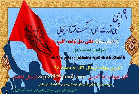 مدير کانون فرهنگي منتظران ظهور(عج) ابراز داشت: کانون فرهنگي هنري منتظران ظهور(عج) کازرون همزمان با گراميداشت حماسه 9دي روز بصيرت مسابقه فرهنگي در قالب عکس، دلنوشته و کليپ برگزار مي نمايد.